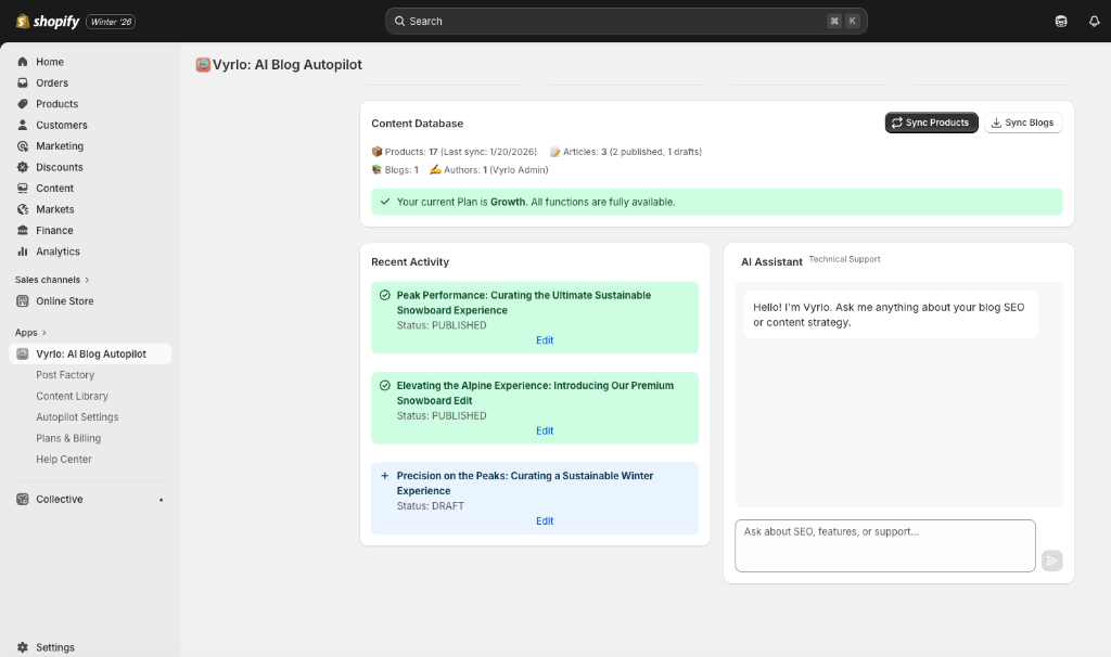 Vyrlo acts as an autonomous marketing team. By analyzing your 'Store DNA' and syncing with your Shopify product catalog, it deploys specialized AI agents that research competitive keywords, generating and publishing high-conversion articles on autopilot.